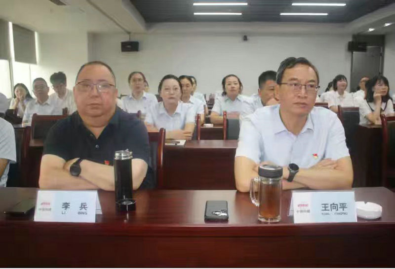 總承包部指揮長李兵(左)、黨支部書記王向平(右)帶頭觀看閱兵
