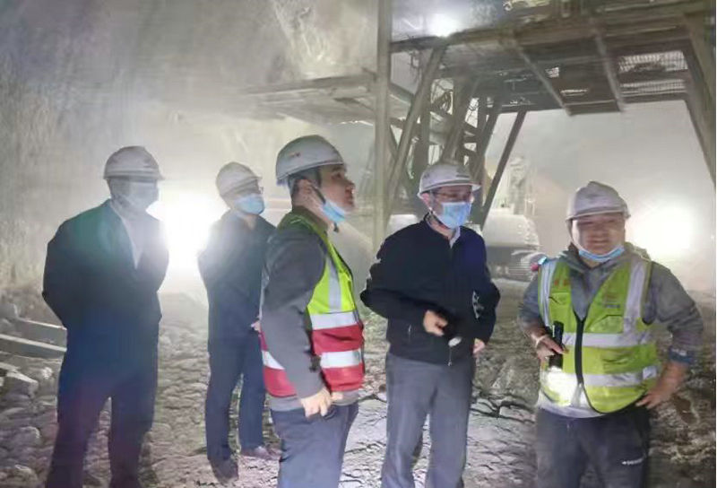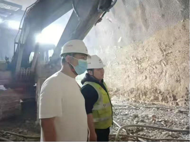 總承包部副指揮長兼總工程師楊振(右2)在中梁山隧道內(nèi)檢查了解情況