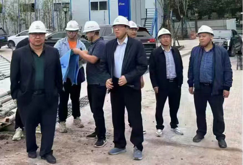 總承包部指揮長李兵(左1)、黨支部書記王向平(左2)、副指揮長李燕(右2)、工程管理部經(jīng)理鄧林義(右2)在現(xiàn)場巡查督導(dǎo)