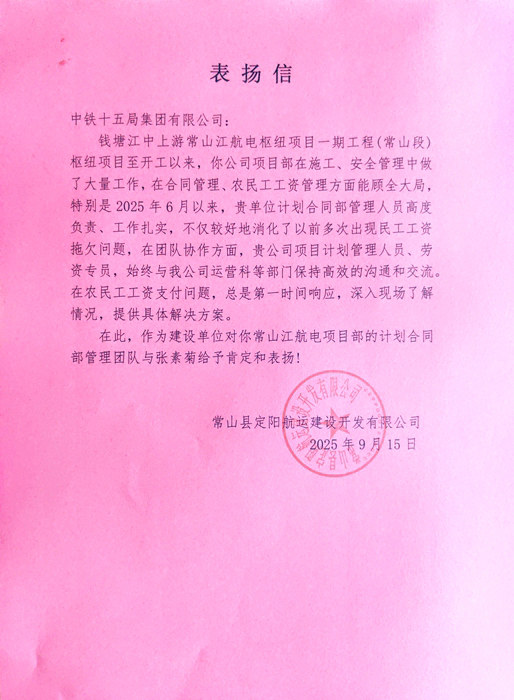 鐵路工程建設(shè)網(wǎng)訊 9月15日下午,中鐵十五局集團(tuán)常山江航電樞紐項目收到常山縣定陽航運開發(fā)建設(shè)有限公司一份表揚信,贊揚該項目在勞務(wù)管理中作出的突出成績。