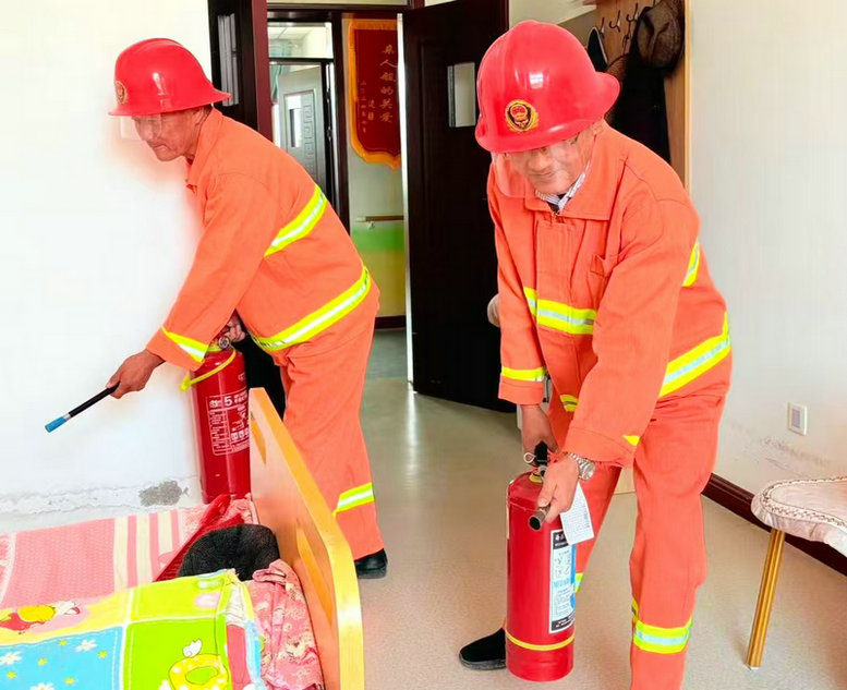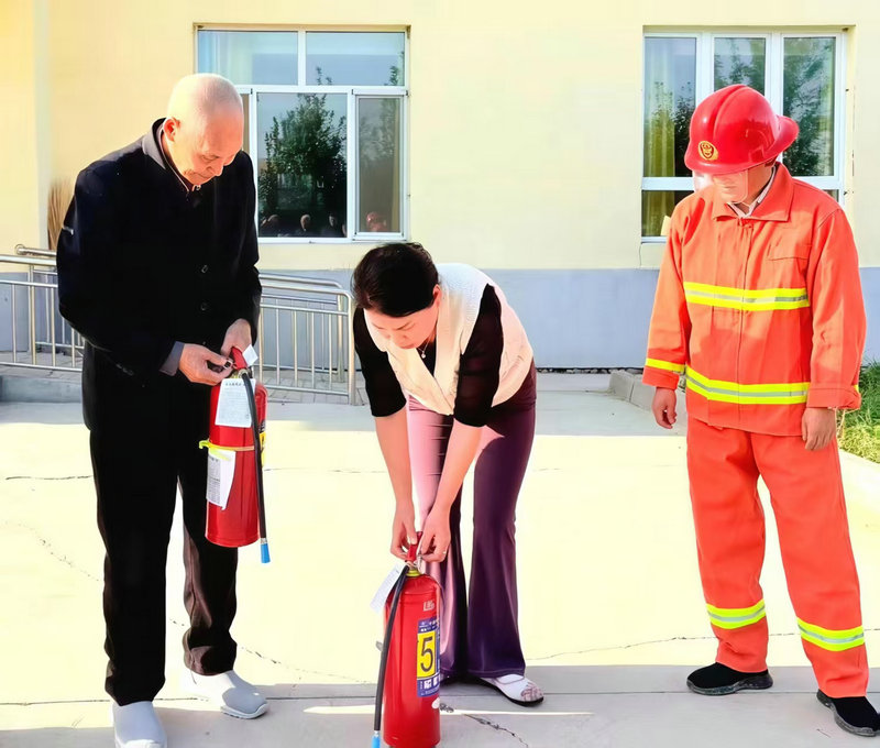 圖2為:六師奇臺110社區(qū)吾家樂寶養(yǎng)老院院長史云智(左二),在開展“雙節(jié)”消防逃生應(yīng)急演練滅火器實際操作培訓(xùn)中,正在檢查干粉滅火期是否完好。