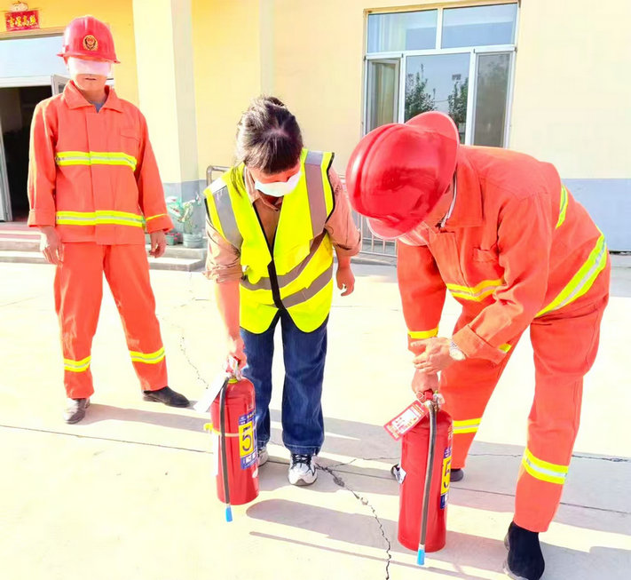 圖5為:該院安全員正在現(xiàn)場培訓(xùn)新員工正確操作干粉工滅火器。