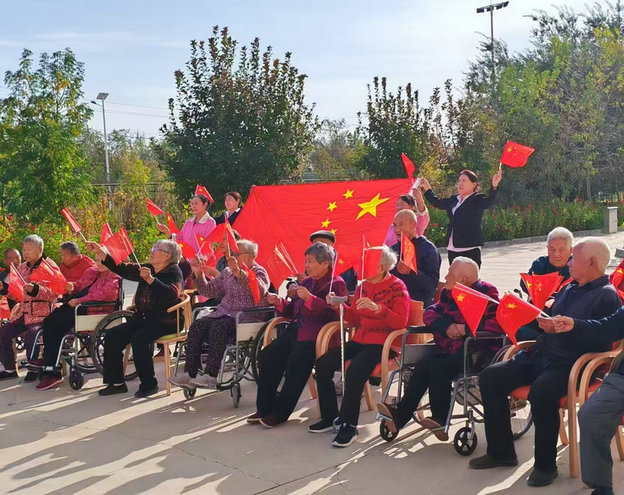 奇臺訊:(通訊員 王學(xué)明 報道)9月27日周末下午,時值國慶及中秋佳節(jié)前夕,第六師奇臺110社區(qū)吾家樂寶養(yǎng)老院內(nèi),陽光明媚,秋高氣爽。為表達(dá)對偉大祖國和大美新疆的熱愛之情,該院的長者及員工們,手舞鮮艷的國旗,用自己的真實(shí)情感,認(rèn)真開展了“高歌頌黨恩 傾心愛中華”活動。