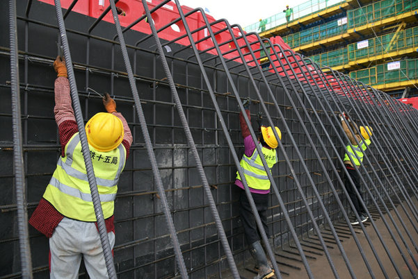 為了加快施工進(jìn)度,項目采用破碎錘、挖掘機、渣土車、推土機、鏟車等聯(lián)合作戰(zhàn)的方法,攻克了堅硬的地下巖層,開挖出5米深、18米寬、400多米長的基坑。在基底澆筑首層混凝土,布設(shè)底板鋼筋網(wǎng)、安裝定型鋼模,再澆筑混凝土,每道工序環(huán)環(huán)相扣,招賢率先完成3米厚的首倉混凝土施工,白虎灘、閣底相繼澆筑完首倉泄洪閘底板,2倉、3倉……與第一倉工藝流程如出一轍。由于二期泄洪閘墩身底板借鑒了一期的經(jīng)驗,施工進(jìn)度大提速。