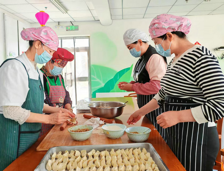 圖為:在國慶佳節(jié)期間及中秋佳節(jié)前夕,第六師奇臺110社區(qū)吾家樂寶養(yǎng)老院院長史云智(右二)與節(jié)日期間堅守崗位的員工們,正在為在院過“雙節(jié)”的“老寶貝們”包餃子。