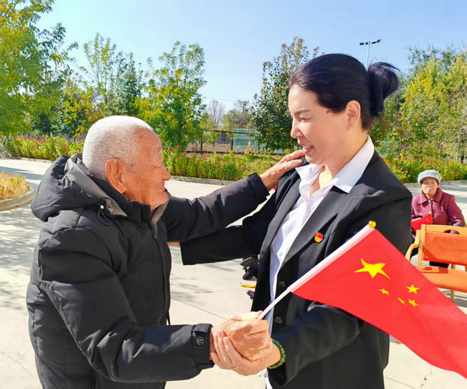 圖2為:第六師奇臺110團社區(qū)吾家樂寶養(yǎng)老院史云智,與在院97歲老爺爺張振民,在中秋佳節(jié)即興跳舞同樂。