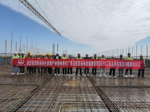 陜西再生資源產業(yè)園標準化廠房及配套基礎設施建設項目共有單體十棟,總建筑面積51402.83㎡。主要包括標準化廠房5棟,辦公樓及研發(fā)中心1棟。1座消防水池,1棟門房及2棟附屬用房。其中單層鋼結構廠房3棟,建筑面積19679.68平方米;雙層鋼結構廠房2棟,建筑面積19888.24平方米。此次封頂?shù)霓k公樓及研發(fā)中心,共6層,采用混凝土框架結構,建筑面積10358.98平方米。