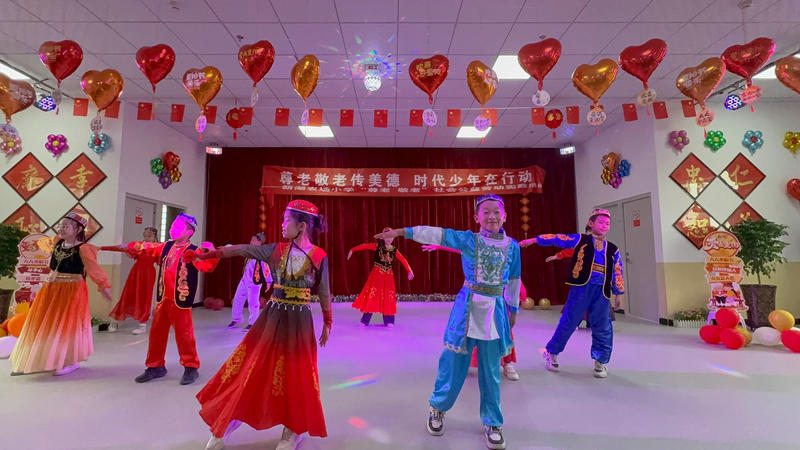 活動在孩子們清脆的歌聲中拉開序幕。伴隨著輕快的旋律,孩子們或獨(dú)唱或合唱,稚嫩的嗓音里滿是真誠,引得爺爺奶奶們頻頻點(diǎn)頭微笑。隨后,舞蹈《哇哈哈》精彩登場,孩子們身著鮮艷的服裝,邁著活潑的舞步,靈動的身影在舞臺上跳躍,將現(xiàn)場的歡樂氛圍推向高潮,長者們的臉上都洋溢著幸福的笑容,紛紛拿出手機(jī)記錄下這熱鬧的瞬間。