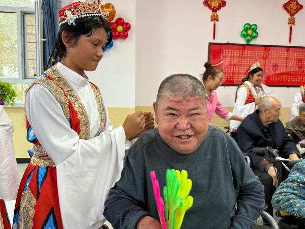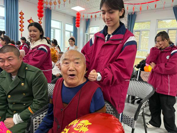 活動現(xiàn)場暖意融融。師生們精心準備了具有民族特色的維吾爾族舞蹈,靈動的舞姿、歡快的旋律贏得了長者們陣陣掌聲,不少老人跟著節(jié)奏輕輕拍手,臉上洋溢著喜悅的笑容,養(yǎng)老院里瞬間充滿了歡聲笑語。表演結束后,師生們迅速切換“志愿模式”,有的拿起掃帚、抹布,認真清掃養(yǎng)老院庭院的落葉與雜物;有的學生則主動走到長者身邊,輕聲細語地詢問身體狀況,為他們捶背捏肩,用嫻熟又輕柔的動作緩解長輩們的疲憊。