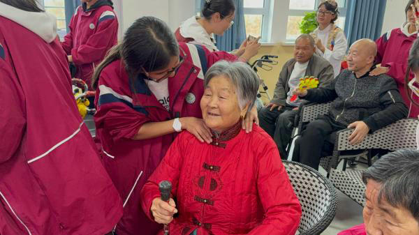 在親切的嘮家常環(huán)節(jié),學生們圍坐在長者身旁,傾聽他們講述過去的故事,分享生活中的趣事。一張張笑臉、一聲聲問候,讓整個養(yǎng)老院都沉浸在溫馨和睦的氛圍里,也讓長者們在重陽佳節(jié)感受到了如同家人般的陪伴與關愛。