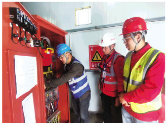 兵團建工水電集團建業(yè)公司承建的兵團二中多功能教育中心建設(shè)項目現(xiàn)場,項目總工和安全部長對總配電室的配電柜進行檢查(劉耿拍攝)