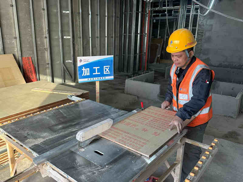 和粉塵,既影響施工人員呼吸健康,又散落覆蓋設(shè)備與地面,導(dǎo)致現(xiàn)場(chǎng)臟亂、清理耗時(shí),更因木屑易燃多次被列為消防隱患。為從源頭解決問(wèn)題,該項(xiàng)目部團(tuán)隊(duì)立足實(shí)際需求,巧妙加裝鋸末回收吸塵裝置,結(jié)合設(shè)備結(jié)構(gòu)實(shí)際,創(chuàng)新將吸塵點(diǎn)設(shè)置在臺(tái)鋸下方,鋸片工作區(qū)域的底部出料口處是鋸末拋出的主要通道,通過(guò)在臺(tái)鋸底座加裝金屬導(dǎo)流槽,將切割產(chǎn)生的碎屑直接導(dǎo)入下方連接的耐磨橡膠管道,再由工業(yè)吸塵器負(fù)壓抽吸至防靜電集塵袋中,實(shí)現(xiàn)“切在哪,吸在哪”的高效回收。而上方則保留原有鋸片防護(hù)罩,兼具安全防護(hù)與防塵隔離功能,避免操作人員受到機(jī)械傷害,同時(shí)減少粉塵向上擴(kuò)散。“現(xiàn)在切板子灰塵少,眼睛不刺撓,地上也干凈。”現(xiàn)場(chǎng)的木工師傅說(shuō)道。該裝置不僅改善了木工作業(yè)區(qū)環(huán)境,更體現(xiàn)了項(xiàng)目團(tuán)隊(duì)從細(xì)節(jié)處求突破的精益管理思路。下一步,該事業(yè)部將持續(xù)鼓勵(lì)一線人員立足現(xiàn)場(chǎng),以更多“巧思”推動(dòng)施工管理提質(zhì)增效。