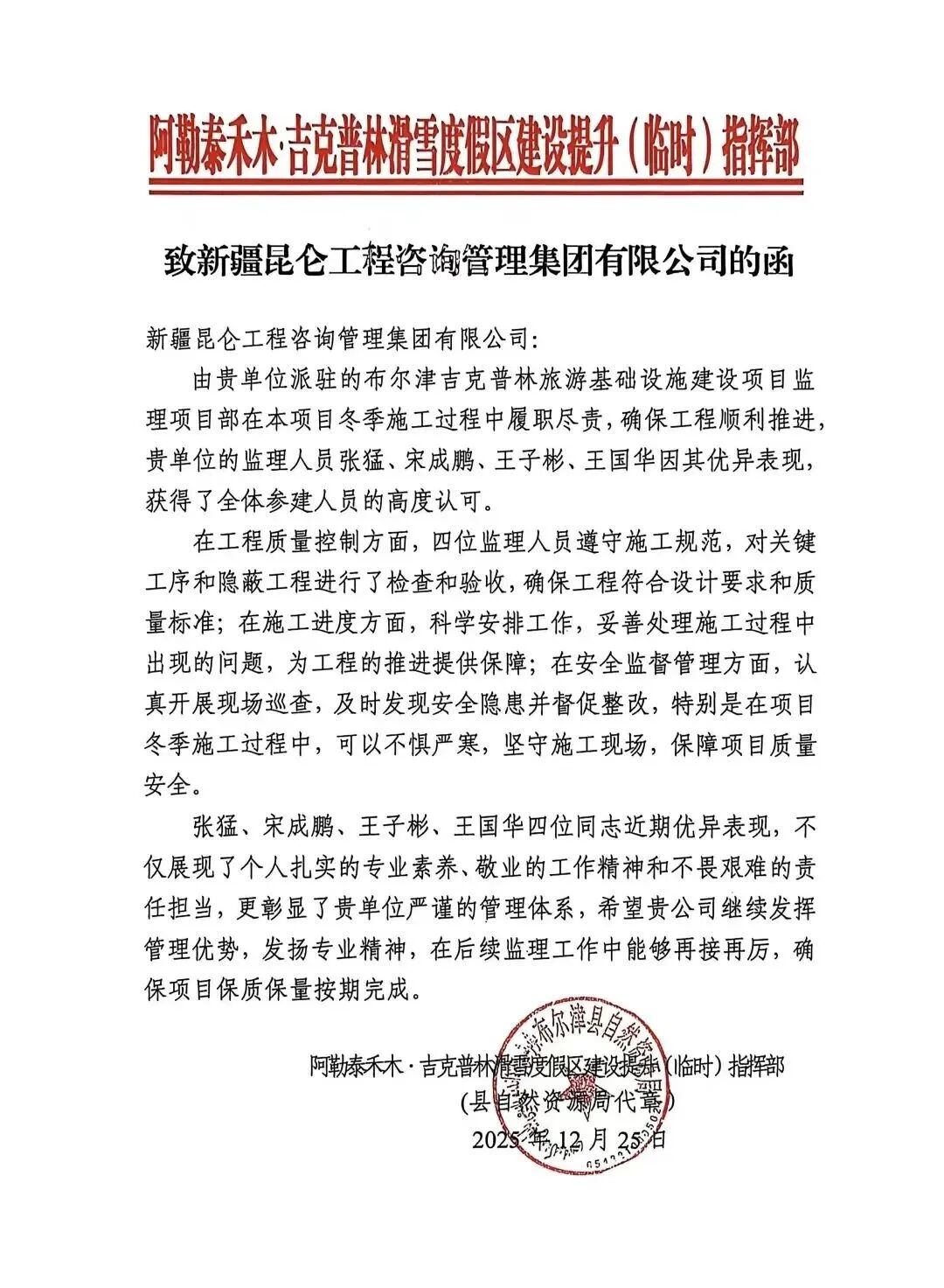 通訊員(陳語涵)12月25日,昆侖咨詢管理集團(tuán)派駐布爾津吉克普林旅游基礎(chǔ)設(shè)施建設(shè)項目的監(jiān)理團(tuán)隊,憑借在高寒環(huán)境下的卓越履約表現(xiàn),獲得阿勒泰禾木?吉克普林滑雪度假區(qū)建設(shè)提升(臨時)指揮部表揚函,以專業(yè)實力與責(zé)任擔(dān)當(dāng),詮釋了工程咨詢領(lǐng)域的“昆侖標(biāo)桿”。