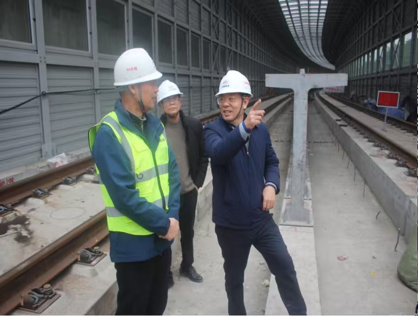 總承包部黨支部書記沈北林(右1)在19標(biāo)軌道鋪設(shè)現(xiàn)場(chǎng)進(jìn)行安全工作檢查督導(dǎo)