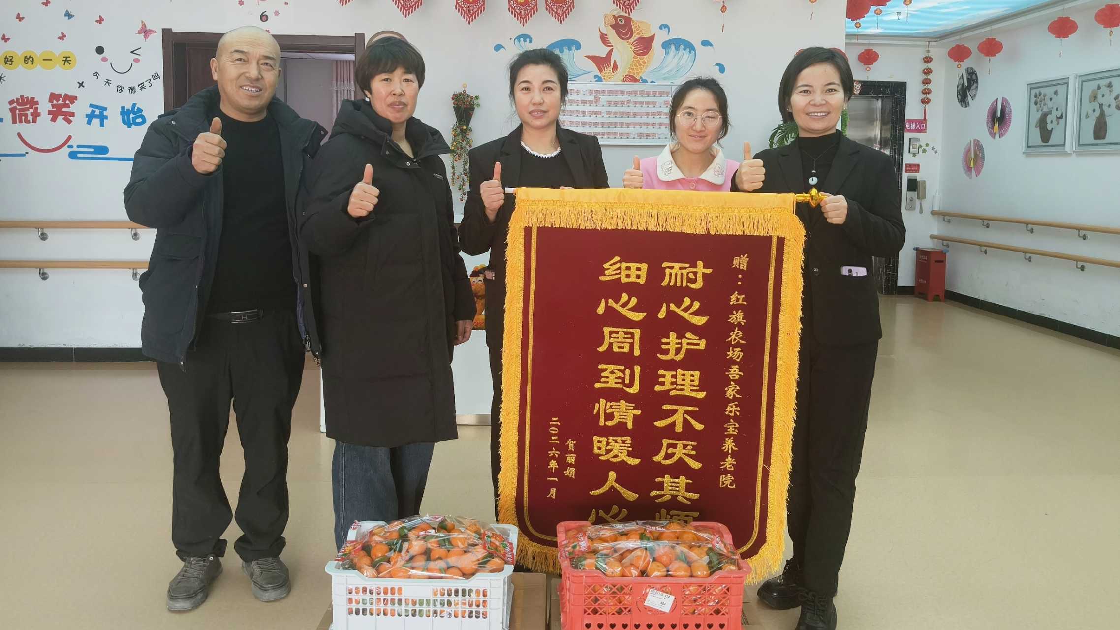 中國鐵路工程建設網(wǎng)訊(通訊員王蕊報道)2026年1月15日,新春將至的第六師紅旗農(nóng)場吾家樂寶養(yǎng)老院暖意融融。賀貴財老人的家屬專程趕來,將一面飽含敬意的錦旗與兩份橘子、一件香蕉、一件蘋果等愛心水果,鄭重送到工作人員手中,用最質(zhì)樸的方式表達深切感念。