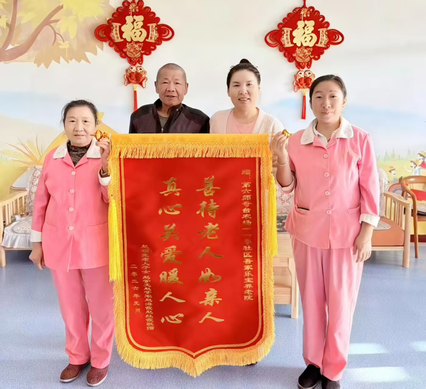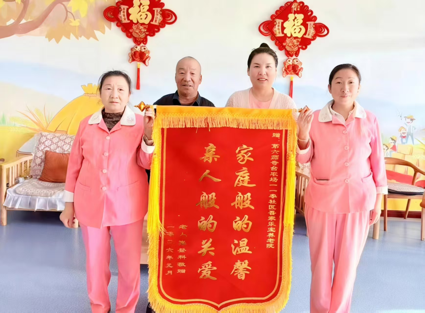 圖2為:在院長者趙領先(左二)為第六師奇臺農(nóng)場110社區(qū)吾家樂寶養(yǎng)老院員工們送來了錦旗,對該養(yǎng)老院的精準規(guī)范化養(yǎng)老服務,表示由衷地感謝。
