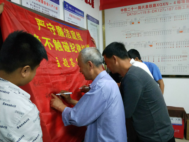 項(xiàng)目部全體干部職工在紅幅上簽下自己的名字,這不僅僅是一個(gè)名字,而是代表了一份承諾,一份對黨、對自己的承諾!