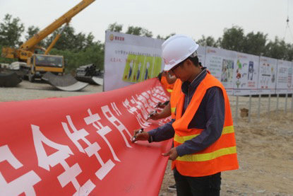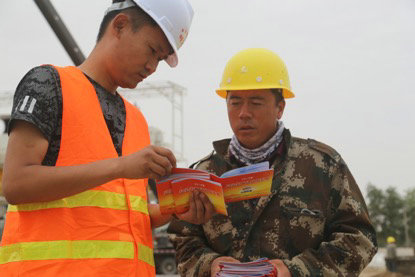 “我是一名中國鐵建員工……我鄭重承諾……將以實(shí)際行動(dòng),確保企業(yè)生產(chǎn)安全、產(chǎn)品優(yōu)質(zhì)!”在項(xiàng)目部舉行的“安全生產(chǎn)月”宣誓活動(dòng)中,全體參建職工莊嚴(yán)宣誓,同時(shí)在活動(dòng)橫幅上鄭重的簽下自己的名字。同時(shí),項(xiàng)目部給每一位給勞務(wù)人員發(fā)放了安全宣傳手冊(cè),并一一講解了安全施工應(yīng)注意的事項(xiàng),用實(shí)際行動(dòng)履行安全責(zé)任,增強(qiáng)安全技能,保障安全生產(chǎn)。