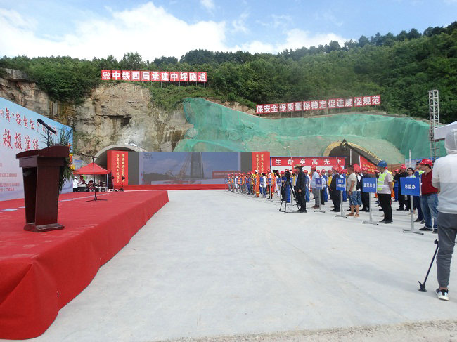 甕開高速公路中坪隧道左右雙向全長1295m,位于甕安縣中坪鎮(zhèn)境內(nèi),隧道穿越中風(fēng)化、強(qiáng)風(fēng)化白云巖,3—5級圍巖,圍巖破碎、節(jié)理裂隙發(fā)育,施工安全風(fēng)險(xiǎn)高,屬控制性重點(diǎn)隧道工程。隧道最大埋深約為130m,目前隧道雙幅已開挖700余m。下午16:00,隨著現(xiàn)場貴州甕開高速公路發(fā)展有限公司總經(jīng)理湯振山宣布演練正式開始,演練場景假設(shè)在隧道左幅出口掌子面鉆爆作業(yè),突然在距掌子面10米處拱頂發(fā)生坍塌,洞內(nèi)填充物及周邊碎石約200方坍方體,現(xiàn)場安全員與值班領(lǐng)導(dǎo)經(jīng)清點(diǎn)人數(shù),發(fā)現(xiàn)1人輕傷、2人下落不明后,立即向項(xiàng)目經(jīng)理后,及時匯報(bào)應(yīng)急救援臨時指揮部,啟動應(yīng)急預(yù)案,幾支救援隊(duì)伍按照臨時指揮部統(tǒng)一調(diào)度,整個救援演練經(jīng)過1時的過程有條不紊,實(shí)施逃生管道為主、人機(jī)配合為輔的救援方式開展。活動演練人員分為治安保衛(wèi)組、技術(shù)方案組、醫(yī)療救護(hù)組、搶險(xiǎn)救援組、新聞信息組,演練分別進(jìn)行了發(fā)現(xiàn)險(xiǎn)情、及時報(bào)告、分析研究、情況處置、行動救援、信息發(fā)布、領(lǐng)導(dǎo)點(diǎn)評等多個環(huán)節(jié),整個過程人員組織、行動迅速、坍方清除,傷員醫(yī)護(hù),專業(yè)有序,應(yīng)急演練達(dá)到如期效果中圓滿結(jié)束。