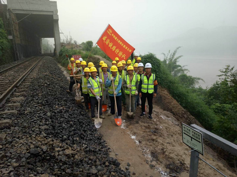由于情況緊急,鐵路部門(mén)已封閉鐵路,暫停通車,并向我單位請(qǐng)求支援。我單位接到鐵路部門(mén)求援后,立即啟動(dòng)抗洪搶險(xiǎn)應(yīng)急預(yù)案,停止一切施工,組織現(xiàn)場(chǎng)全體人員組成搶險(xiǎn)隊(duì),趕赴救援現(xiàn)場(chǎng),配合鐵路部門(mén)進(jìn)行搶險(xiǎn)工作。由于此段鐵路緊鄰山體和長(zhǎng)江,一切救援車輛和物資均無(wú)法到達(dá)搶險(xiǎn)現(xiàn)場(chǎng),搶險(xiǎn)隊(duì)員迅速克服一切困難,就地取材,采用人工堆碼沙袋的方法加固沖垮的路基邊坡,保護(hù)好通信電纜,采用手提和肩挑橡膠桶的方式清理水溝的泥沙。