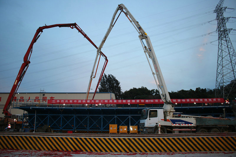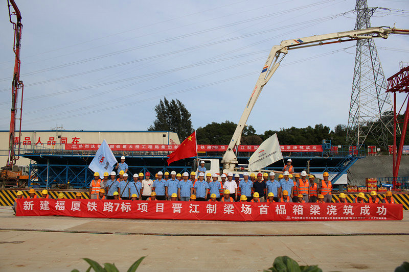 6月5日,天高云淡,陽光明媚,中國鐵建大橋局福廈鐵路7標晉江制梁場一片熱鬧景象,一紅一白兩臺混凝土輸送泵車大臂高聳入云,各種制梁設備整裝待發(fā),施工人員精神抖擻,在一陣鞭炮聲中,首榀箱梁開始澆筑,經過6個小時的連續(xù)施工,宣告預制成功,標志著福廈鐵路7標箱梁預制施工全面拉開序幕。