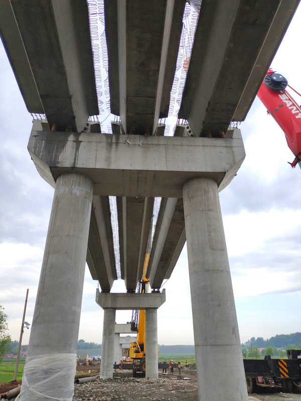 據(jù)了解,該橋全長281.08米, 橋面寬8米,兩側(cè)設(shè)置0.5米寬防撞墻,共計箱梁37片。其中第8孔跨越既有濱綏鐵路,線間距為4.25米,軌面至梁底的高度為6.8米。上部結(jié)構(gòu)采用2-20米+5-25米+30米+4-20米預(yù)力混凝土簡支小箱梁,梁高1.6米。頂寬中梁2.4米、邊梁2.4米,底寬1.0米。下部結(jié)構(gòu)采用柱式橋墩,鉆孔灌柱樁基礎(chǔ),橋墩柱直徑1.3米,橋墩樁基直徑1.5米??缇€孔柱徑1.4米、樁徑1.6米,樁基類型為摩擦樁。橋臺采用肋板式橋臺,工字型承臺,樁基礎(chǔ),樁徑為1.2米。橋墩均設(shè)置地系梁橫向聯(lián)結(jié),全橋蓋梁采用鋼筋混凝土結(jié)構(gòu)。