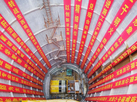 隧道掘進(jìn)時(shí),由液壓千斤頂系統(tǒng)將預(yù)制1號(hào)管節(jié)與頂管機(jī)一起頂進(jìn)隧道洞口,同時(shí),頂管機(jī)前置刀頭將巖石磨碎與水形成泥漿外排出去,前進(jìn)2.5米后,將2號(hào)管節(jié)與1號(hào)尾端相接,繼續(xù)向前頂推,直至將308節(jié)管節(jié)全部相接,頂管機(jī)頂進(jìn)接收井后吊出,管節(jié)就會(huì)鑲嵌在巖層里,形成一條完整的隧道。