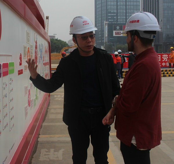 項(xiàng)目黨工委書記萬子兵(左)向新華社廣東分社外國(guó)記者介紹黨建實(shí)踐基地情況