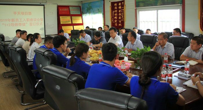 “1+2 導(dǎo)師帶徒”簽字儀式 在7名新入職員工及4名頂崗實習(xí)生自我介紹環(huán)節(jié)中,他們表示:非常高興也非常榮幸的加入到平天項目這個大家庭,這里不僅為他們提供了一個成長鍛煉、展示自我的良好平臺,也讓他們有機(jī)會認(rèn)識更多的新同事、新朋友;他們還表示,在以后的工作中,方方面面的知識都需要向老職工學(xué)習(xí),希望能得到大家的認(rèn)真指教,使自己快速成長。