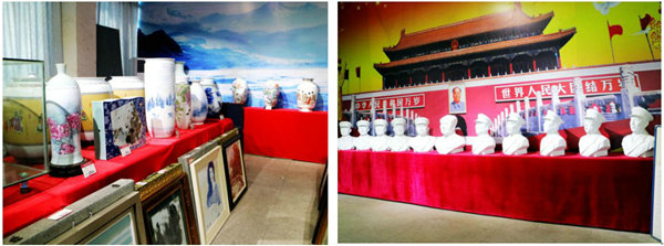 出了接待間,在展廳的進(jìn)門位置,一尊毛澤東塑像擺在迎門處,十大元帥塑像分列兩邊,天安門城樓背景映襯之后。鐵道兵戰(zhàn)友的各種酒、紫砂壺、瓷器、繪畫、書法等產(chǎn)品分列在各個(gè)展柜、墻壁和展臺(tái),真是琳瑯滿目,欣賞無暇??恐髽I(yè)的支撐和個(gè)人的初心守望,“四方老鐵文化園”從2017年8月生存至今,展品不斷豐富。
