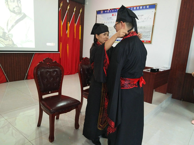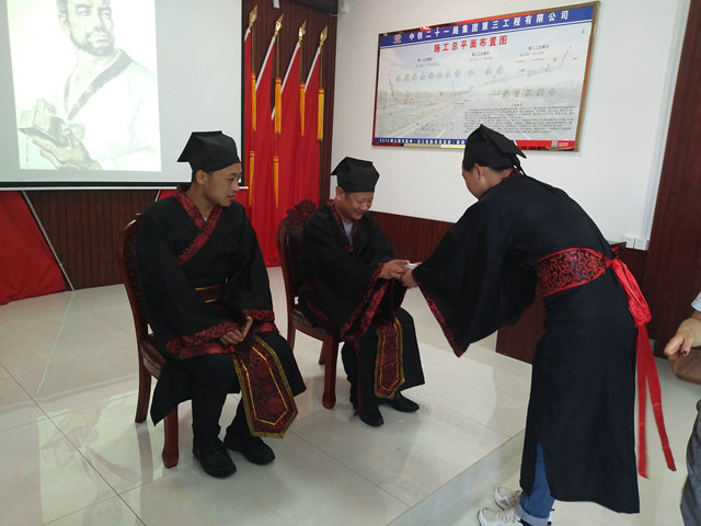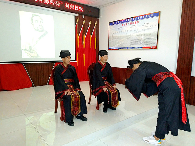 拜師禮以拜魯班,倡導(dǎo)工匠精神,將S334峨山路東延伸新建項(xiàng)目建成品質(zhì)工程;拜指導(dǎo)老師、敬茶,指導(dǎo)老師給徒弟正衣冠,簽訂師帶徒協(xié)議,正式結(jié)成師徒。