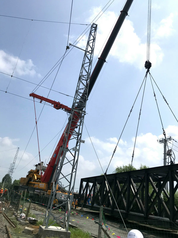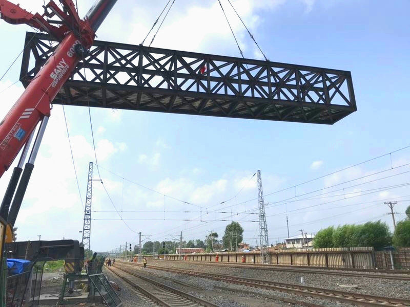 該橋位于濱綏鐵路烏吉密-尚志區(qū)間,橫跨既有電氣化鐵路,地處居民區(qū),場(chǎng)地作業(yè)面狹窄。承擔(dān)施工任務(wù)的中鐵二十三局集團(tuán)哈牡電氣化項(xiàng)目部,克服重重困難,結(jié)合現(xiàn)場(chǎng)實(shí)際,提前準(zhǔn)備、周密部署,與有關(guān)運(yùn)輸站段緊密配合、協(xié)同作戰(zhàn)。牢牢把握鐵路既有線安全防護(hù)、吊裝施工高空作業(yè)等重點(diǎn)環(huán)節(jié),進(jìn)行了超前預(yù)想和風(fēng)險(xiǎn)點(diǎn)防控,把責(zé)任和措施落到實(shí)處。為了確保安全萬(wàn)無(wú)一失,項(xiàng)目部調(diào)集了一臺(tái)600噸重型汽車式起重機(jī),保證了鋼梁架設(shè)施工的順利完成,此舉為加快天橋的下步附屬施工進(jìn)度創(chuàng)造了條件。