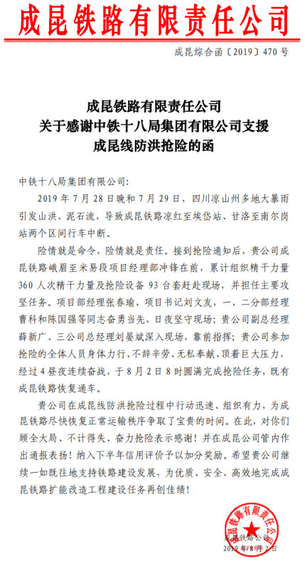 本站成都電 (記者 伍振 通訊員 李陽 馬士力)日前,成昆鐵路有限責(zé)任公司向中鐵十八局集團(tuán)發(fā)來關(guān)于支援既有成昆鐵路防洪搶險的感謝函,感謝中鐵十八局集團(tuán)在既有成昆鐵路防洪搶險過程中行動迅速、組織有力,為成昆鐵路盡快恢復(fù)正常運(yùn)輸秩序爭取了寶貴的時間,對中鐵十八局集團(tuán)顧全大局、不計(jì)得失、奮力搶險表示感謝,并在成昆公司管內(nèi)作出通報表揚(yáng),納入下半年信用評價予以加分獎勵。