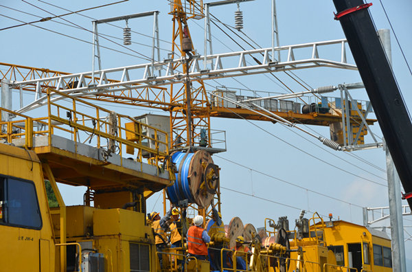 圖為:下午高溫時(shí)段,作業(yè)隊(duì)利用恒張力放線車進(jìn)行接觸線架設(shè)施工。