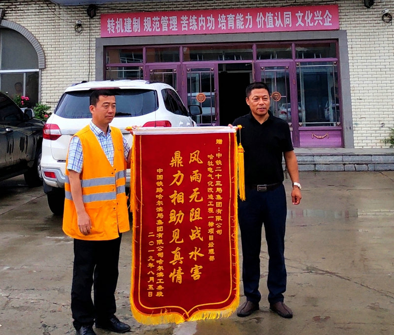 8月22日,中國(guó)鐵路哈爾濱局集團(tuán)有限公司哈爾濱工務(wù)段副段長(zhǎng)李軼群將“風(fēng)雨無(wú)阻戰(zhàn)水害、鼎力相助見真情”錦旗專程送到中鐵二十三局哈牡項(xiàng)目部表達(dá)感激之情。