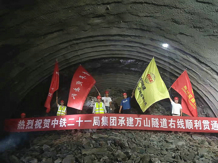 圖為建設(shè)者慶祝萬(wàn)山隧道右線安全貫通萬(wàn)山隧道是二標(biāo)段控制工程,也是全線重難點(diǎn)工程,施工場(chǎng)面宏偉。在隧道出口,開(kāi)挖裸露的山體被綠色防塵網(wǎng)嚴(yán)嚴(yán)實(shí)實(shí)地覆蓋,地面全部硬化,綠色施工理念在這里得到充分體現(xiàn)。各種宣傳牌和展板傳遞著中國(guó)鐵建的企業(yè)文化理念。“周密策劃,科學(xué)管理,忠于設(shè)計(jì),精心施工,敬畏生命,工地就是戰(zhàn)場(chǎng),工期就是尊嚴(yán)”等標(biāo)語(yǔ)展示了中鐵二十一局三公司注重安全質(zhì)量,嚴(yán)守信譽(yù),兌現(xiàn)工期的莊嚴(yán)承諾。