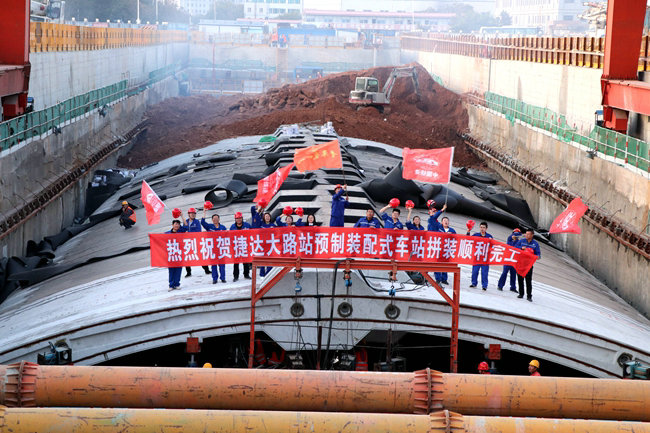 9月25日,17點(diǎn)30分,一片重達(dá)54.3噸、長(zhǎng)10.057米的混凝土預(yù)制件E塊,在80T+80T龍門吊的吊裝下,在現(xiàn)場(chǎng)技術(shù)人員的精心指揮下,精準(zhǔn)落座在拼裝臺(tái)車上,工人師傅迅即展開(kāi)調(diào)整就位。至此宣告,由中鐵十四局集團(tuán)承建的長(zhǎng)春地鐵2號(hào)線西延線捷達(dá)大路站預(yù)制裝配式車站拼裝順利完工。頓時(shí),鞭炮聲和歡呼聲在施工現(xiàn)場(chǎng)響成一片......