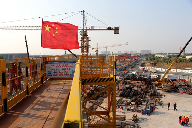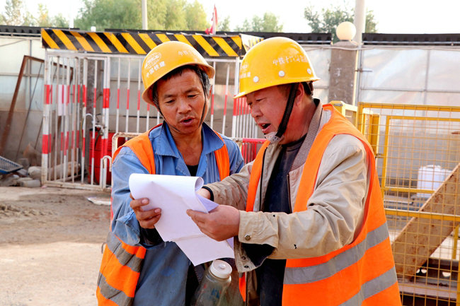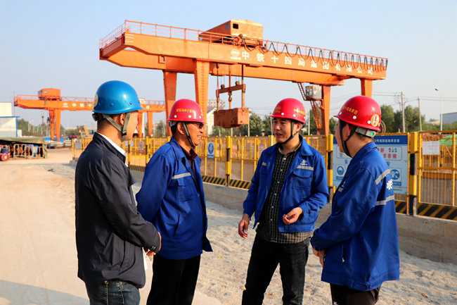 我挎著相機(jī)從環(huán)島工地一路向北走去,目睹工地圍擋四周上面的彩旗在晨風(fēng)中招展,鮮紅莊重的五星紅旗在人行天橋上空高高飄揚(yáng),突顯一派節(jié)日的氛圍。整個(gè)工地人來(lái)人往,忙而不亂,施工現(xiàn)場(chǎng)機(jī)器轟鳴、有條不紊。監(jiān)理工程師姚金亞、項(xiàng)目部技術(shù)負(fù)責(zé)人馬傳程、工區(qū)經(jīng)理寧林正帶領(lǐng)工程部、安質(zhì)部等負(fù)責(zé)人在現(xiàn)場(chǎng)巡查。