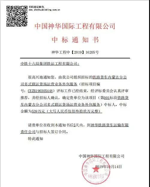本站訊 10月14日,中鐵十六局鐵運公司包神指收到中標通知書,成功中標神華鐵路貨車內(nèi)蒙古分公司多式聯(lián)運貨場運營業(yè)務(wù)外包服務(wù)。
