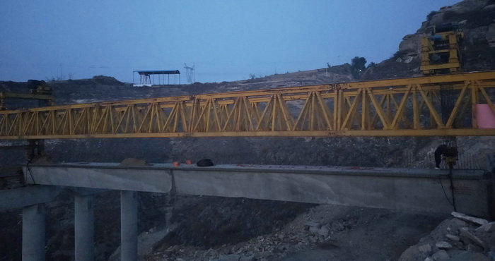 圖為首片箱梁架設(shè) 當(dāng)天架梁施工開始時,40米長、重一百多噸的箱梁,經(jīng)過1個多小時的運輸,第一片箱梁順利抵達寨峁大橋橋頭。早已等候在現(xiàn)場的架梁工人在架梁總指揮的統(tǒng)一指揮下,提梁、移梁、落梁等系列架梁工作隨即有序展開,在經(jīng)歷了3個多小時緊張有序工作后,第一片箱梁安全平穩(wěn)架設(shè)成功。