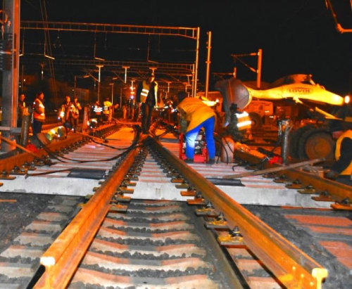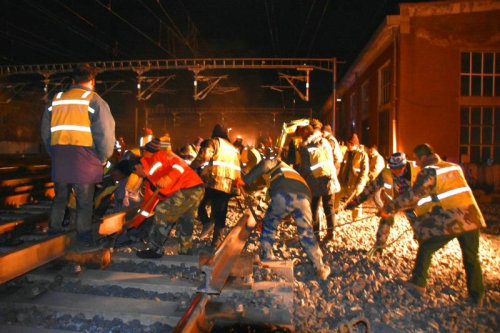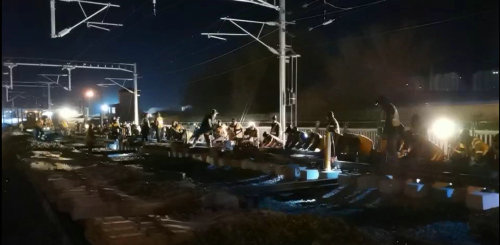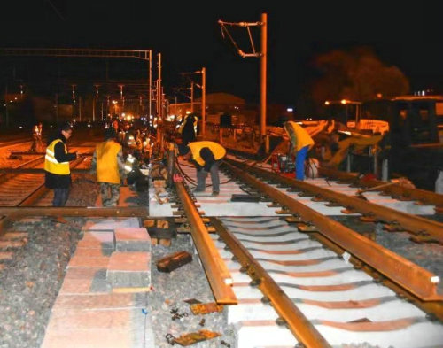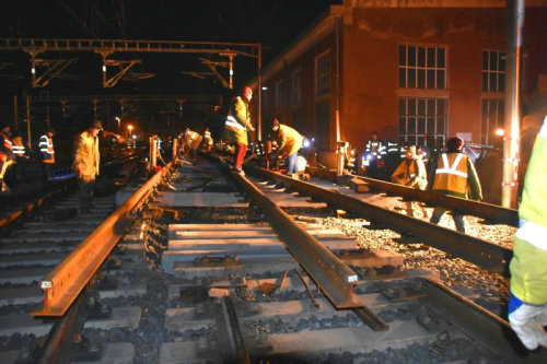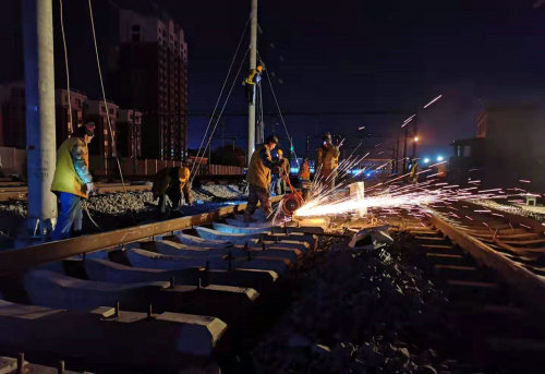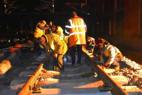 為確保封鎖施工順利,零失誤完成任務(wù),項(xiàng)目部領(lǐng)導(dǎo)班子從三方面入手,做好上場(chǎng)策劃。一是應(yīng)急準(zhǔn)備,針對(duì)封鎖施工成立了應(yīng)急小組,制定了《佳木斯站6、7站臺(tái)工程封鎖插入道岔施工方案》,為封鎖打好基礎(chǔ);二是上下聯(lián)動(dòng),做到“三到位、四保障”,即安全保障到位、思想動(dòng)員到位、防寒保暖到位,組織保障、技術(shù)保障、后勤保障、物資保障,為封鎖作業(yè)人員提供全方位的保障。三是統(tǒng)籌協(xié)調(diào),開展百人動(dòng)員會(huì),集中調(diào)動(dòng)2臺(tái)挖掘機(jī)、2臺(tái)鏟車、5臺(tái)軌道縱移平車、1組小型搗固機(jī)、6臺(tái)提升機(jī)、8組軟軸搗固機(jī)等。從11月1日到11月4日,項(xiàng)目部完成了連續(xù)四天的封鎖施工,每天從夜間22點(diǎn)一直作業(yè)到第二天凌晨5點(diǎn),工人們?cè)趷毫拥臈l件下,標(biāo)準(zhǔn)化執(zhí)行既有線斷軌、清除軋石-道岔插入-連接線路-線路整理-線路聯(lián)通五道工序,順利完成了過(guò)渡便線拆除、新線連通以及6、7站臺(tái)相關(guān)配套工程等既定施工任務(wù),為后續(xù)工作贏得了時(shí)間。