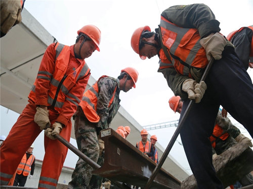 “我們每天組織300多人,十幾臺(tái)大型施工機(jī)具進(jìn)行沖刺施工作業(yè),僅從11月至今這一個(gè)月的時(shí)間里,我們就已完成了新道岔鋪設(shè)17組、增建線路5.8公里,晝夜不停,全員參與。目的只有一個(gè),就是通過(guò)我們一局將士的努力,讓更多的重慶人民坐上高鐵,便捷出行,更是在12月26日毛主席誕辰來(lái)臨之際獻(xiàn)出我們的真誠(chéng)大禮。”項(xiàng)目部負(fù)責(zé)人在談起最后階段的施工時(shí),無(wú)不動(dòng)情的說(shuō)道。