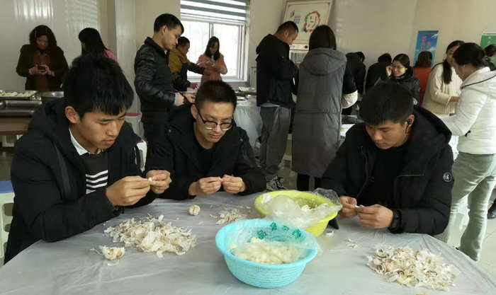 圖為男女員工齊上陣到食堂包餃子