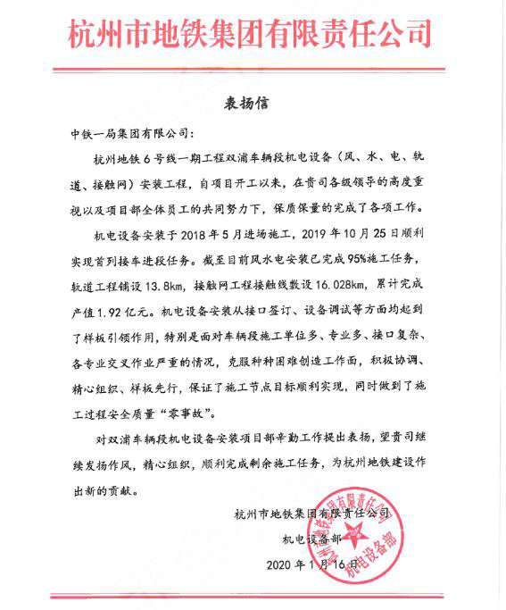 杭州地鐵公司在信中指出,自雙浦車(chē)輛段機(jī)電安裝工程開(kāi)工以來(lái),項(xiàng)目部積極克服了種種困難,積極溝通創(chuàng)造工作面,以優(yōu)質(zhì)、高效的服務(wù)推進(jìn)工程建設(shè),從樣板施工、接口簽訂、設(shè)備調(diào)試等方面均起到了樣板引領(lǐng)作用。2019年完成風(fēng)水電安裝95%的施工內(nèi)容,其中軌道工程鋪設(shè)13.8公里、接觸網(wǎng)工程接觸線敷設(shè)16.028公里,保證了施工節(jié)點(diǎn)目標(biāo)的順利實(shí)現(xiàn),做到了施工過(guò)程安全質(zhì)量“零事故”。希望項(xiàng)目部繼續(xù)精心組織施工,持續(xù)強(qiáng)化現(xiàn)場(chǎng)管理,圓滿完成剩余施工任務(wù),為杭州地鐵建設(shè)作出新的貢獻(xiàn)。