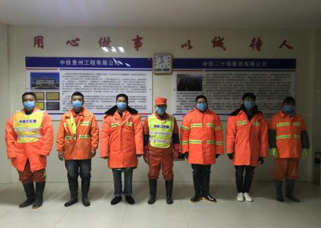 早上六點(diǎn),項(xiàng)目部門口已是白雪皚皚,昨晚安順地區(qū)連夜降雪,厚度足以沒過雙腳,10名員工安全帽、口罩、手套和反光防護(hù)服全身武裝,間隔一米一字排開。
