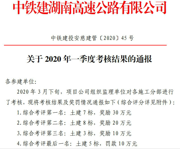 近期,中鐵建湖南高速公路有限公司(業(yè)主單位)開展了2020年一季度綜合考核,中鐵二十三局四公司安慈項目土建7標在全線9個參建單位中脫穎而出,榮獲第一名。這也是該項目繼2019年三、四季度信用評價第一名、“大干60天”勞動競賽第一名及2019年度信用評價考核第一名(綜合得分:96.28,項目內評價級別:AA)后再次蟬聯(lián)第一名,喜獲獎勵30萬元。