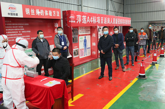 萍蓮A4標項目是湖北企業(yè),大多數(shù)參建人員都來自湖北,目前近半數(shù)湖北籍參建人員已通過“贛通碼”,順利返回工地。為了消除參建人員恐慌心理,確保百分百安全生產(chǎn),項目部專職副書記劉濤多次與萍鄉(xiāng)市湘東區(qū)衛(wèi)健委溝通協(xié)調(diào),請來了衛(wèi)健委的專業(yè)檢測團隊,為湖北返崗人員做核酸檢測。當(dāng)日做的核酸檢測,次日就可以出結(jié)果。