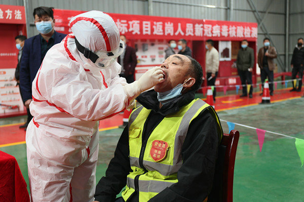 4月3日,在中鐵十一局二公司萍蓮A4標項目安全體驗館內(nèi),專業(yè)檢測醫(yī)務(wù)團隊正在使用核酸檢測采樣管,為湖北返崗人員進行咽拭子采樣。