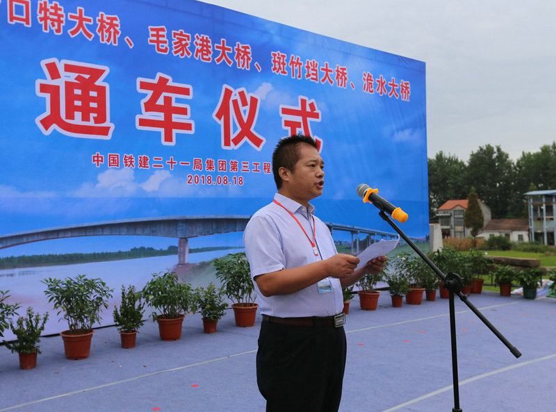 入秋的荊楚大地告別了桑拿天氣。作為通車典禮主會(huì)場(chǎng)的黃金口特大橋披上了節(jié)日的盛裝,遠(yuǎn)遠(yuǎn)看見(jiàn)巨大的藍(lán)色幕墻上“黃金口、毛家港、斑竹垱、洈水河大橋通車儀式”幾個(gè)紅色大字十分醒目。大橋兩側(cè)的彩旗迎風(fēng)飄揚(yáng),右側(cè)四塊巨幅展板分別是公司企業(yè)簡(jiǎn)介、公安縣四座大橋施工圖片展示、中鐵二十一局三公司承建的其他重大工程圖片、企業(yè)獲得的獎(jiǎng)杯、獎(jiǎng)牌等榮譽(yù)。主席臺(tái)在青翠的盆景點(diǎn)綴下,更增添了喜慶之色。參加慶典的中鐵二十一局三公司、公安縣黨政機(jī)關(guān)、公安縣路政執(zhí)法等單位,分別組成了三個(gè)方隊(duì)。通車慶典儀式由中鐵二十一局三公司工會(huì)副主席范軼群主持。