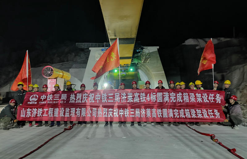 3月9日,隨著雪野2號(hào)中橋1孔箱梁緩緩的落在0號(hào)臺(tái)至1號(hào)臺(tái)上,至此,中鐵三局濟(jì)萊4標(biāo)管段內(nèi)的162孔箱梁架設(shè)任務(wù)順利完成。圓滿(mǎn)實(shí)現(xiàn)了3月10日前完成架梁任務(wù)的施工節(jié)點(diǎn)目標(biāo),該節(jié)點(diǎn)工程的完工標(biāo)志著濟(jì)萊高鐵轉(zhuǎn)入橋面系施工和無(wú)砟軌道的全面施工。